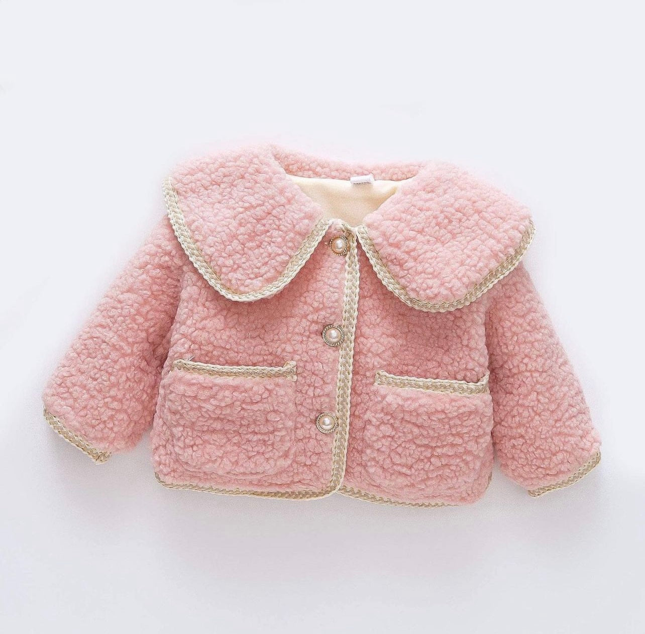 Cotton candy boucle jacket is made of the most soft, luxurious and warm boucle fabric.
