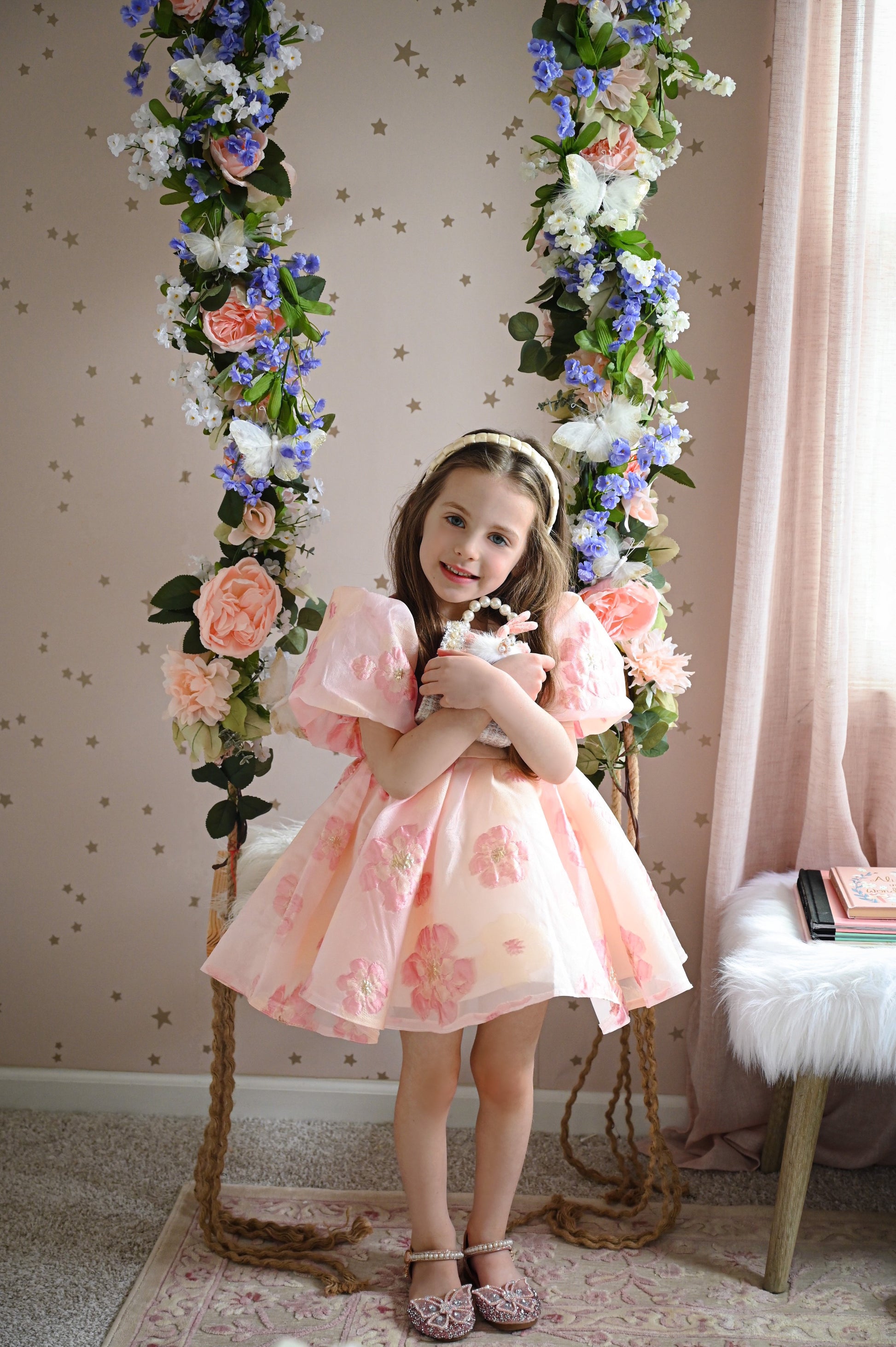 Dreamy floral ball gown is a custom handmade dress. Features hand crafted floral details and puffy shoulders. Such a beautiful piece. Perfect for your princess ! True to size.