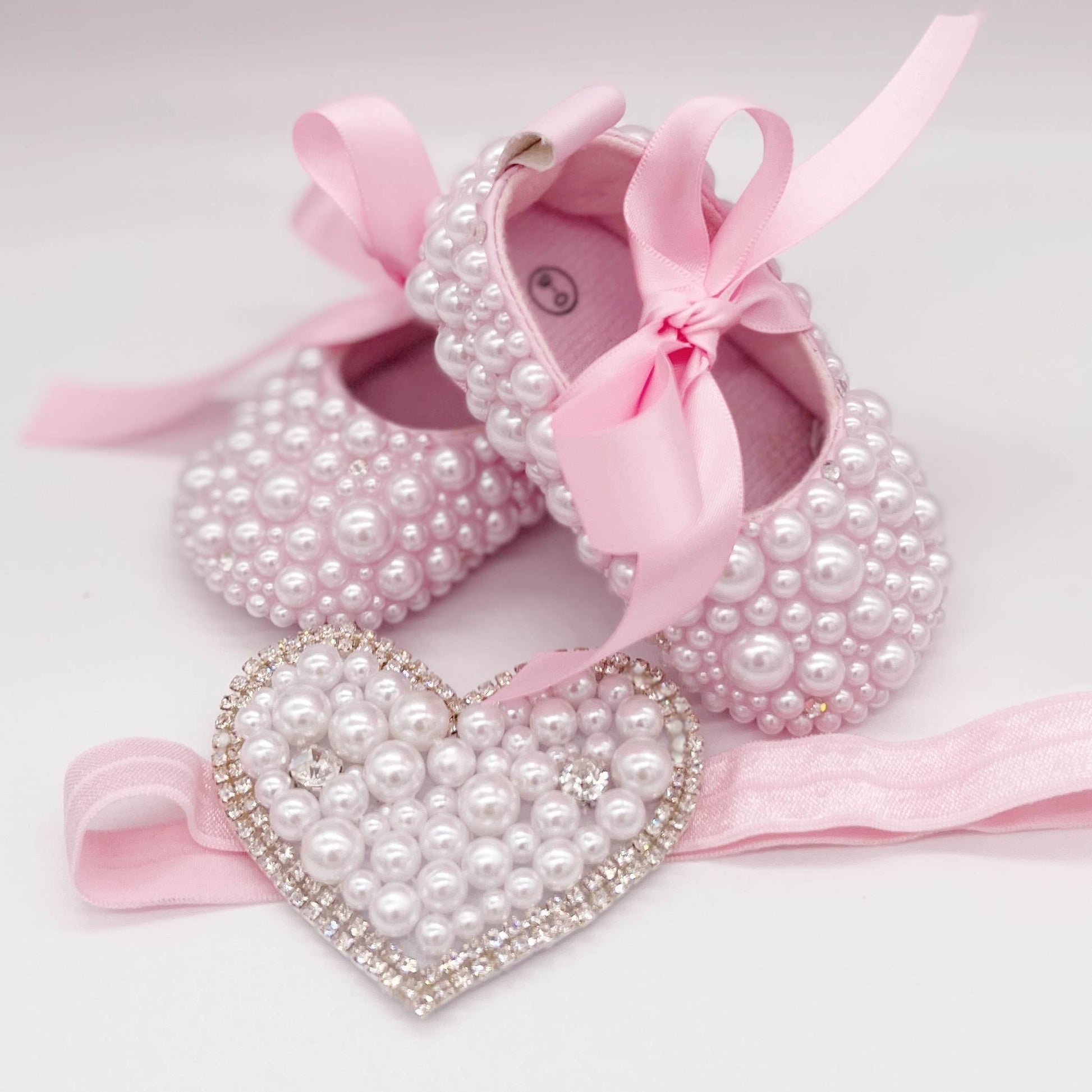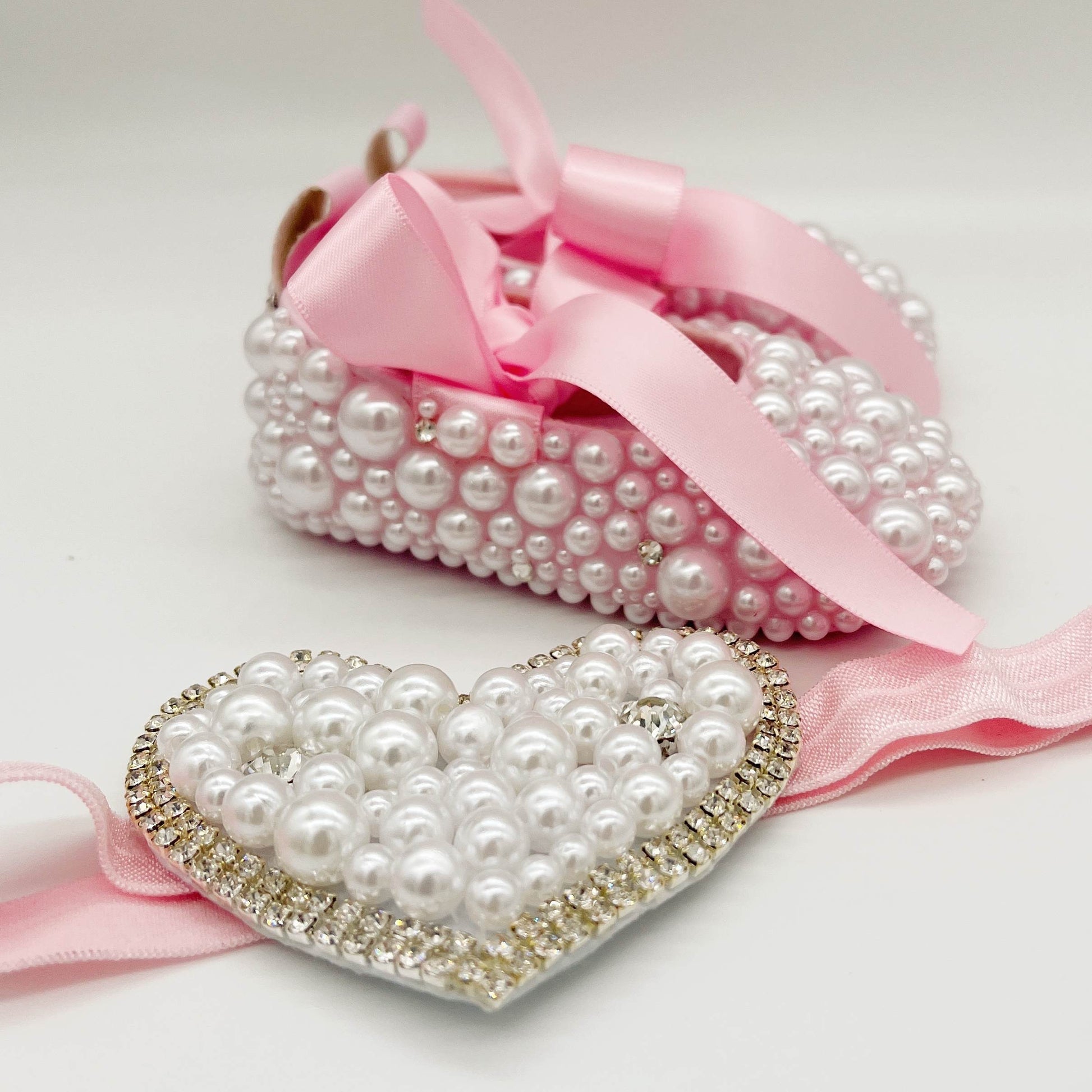 Beautiful pearly 2 piece set - shoes and headband. Hand crafted pearl details are just so beautiful !! Perfect for photo session, baptism, birthday party.