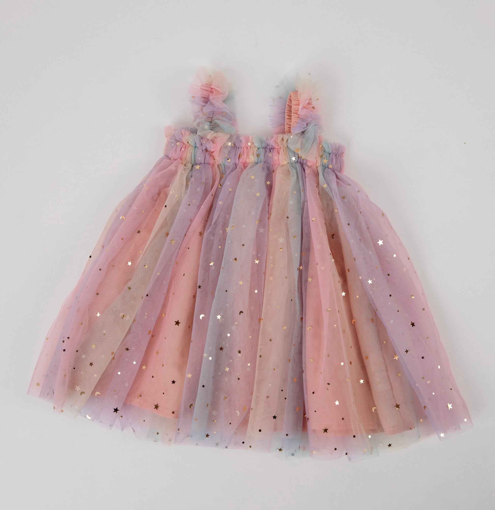 The Rainbow Tulle Dress is made of light tulle and features little star accents. Perfect for any occasion for your little girl